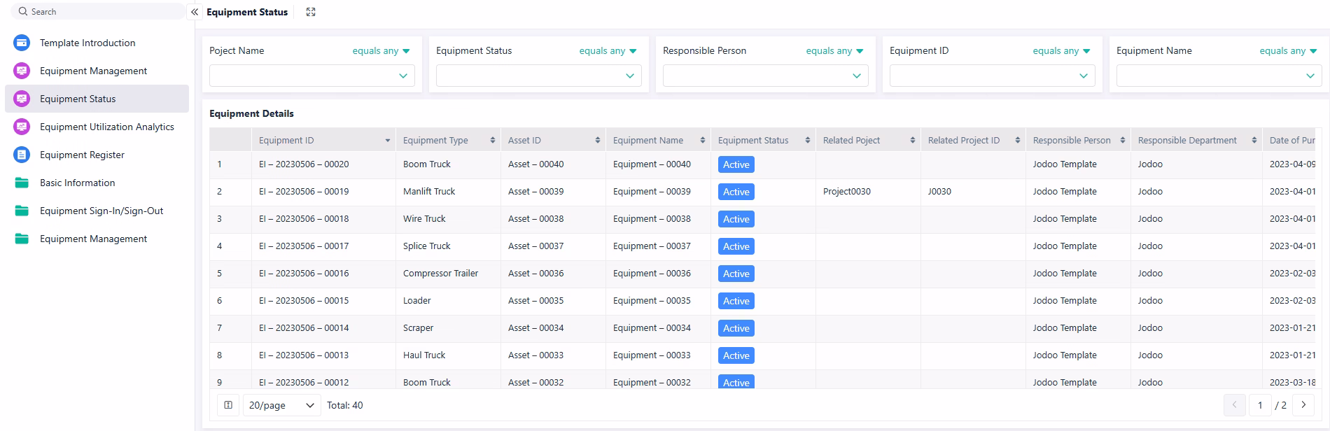 - Equipment Registration. A centralized database to record and maintain detailed information about the company’s equipment fleet, including specifications, purchase dates, maintenance histories, and locations.