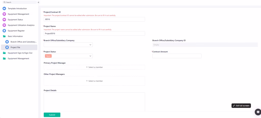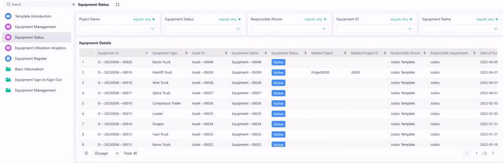 - Equipment Registration. A centralized database to record and maintain detailed information about the company’s equipment fleet, including specifications, purchase dates, maintenance histories, and locations.
