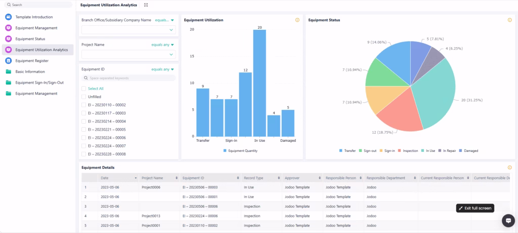 - Site Entry and Exit Management. Functionalities to manage equipment entry and exit at construction sites, ensuring proper documentation, accountability, and tracking of asset movements.