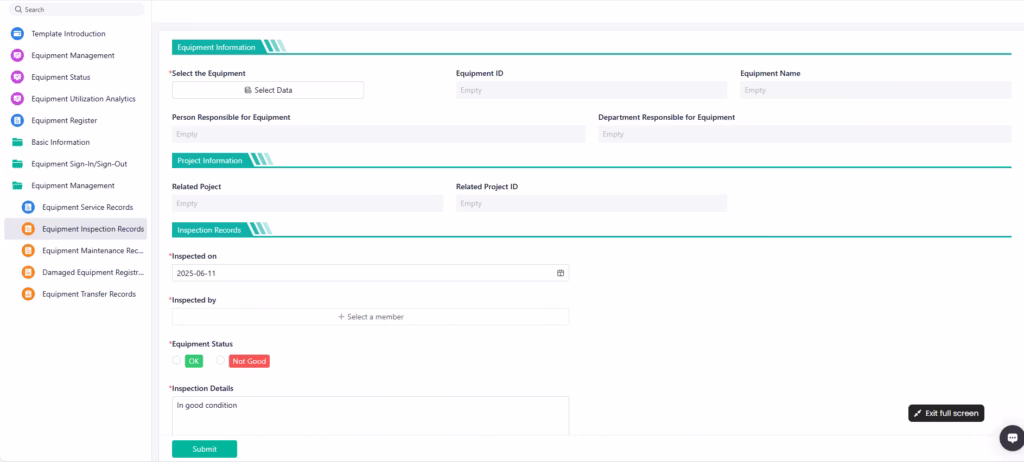 - Equipment Inspection and Compliance. Features for scheduling and documenting equipment inspections, maintaining compliance with safety regulations, and generating inspection reports.