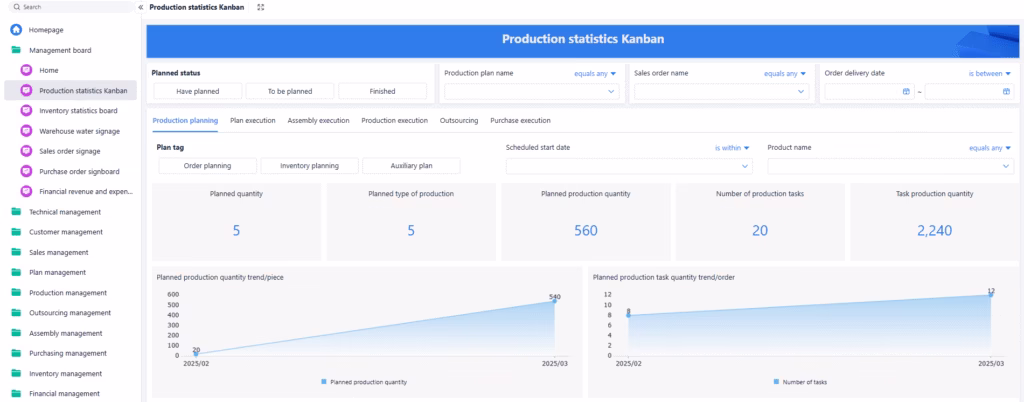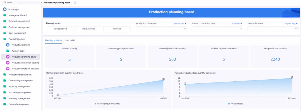 Production planning utilizes BOM (default three levels) and MRP calculations for process scheduling and task allocation.