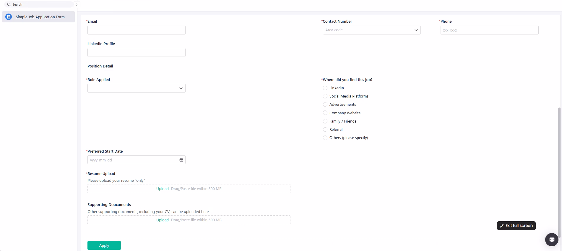 With our Simple Job Application Form, you can easily manage candidate applications, keep detailed records of each applicant, quickly identify top talent, and store candidate information in your company’s talent portal for future reference. Make the hiring process more efficient and effective with our Simple Job Application Form. Try it today!