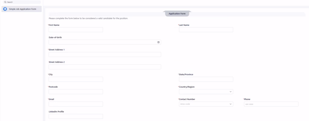 With our Simple Job Application Form, you can easily manage candidate applications, keep detailed records of each applicant, quickly identify top talent, and store candidate information in your company’s talent portal for future reference. Make the hiring process more efficient and effective with our Simple Job Application Form. Try it today!